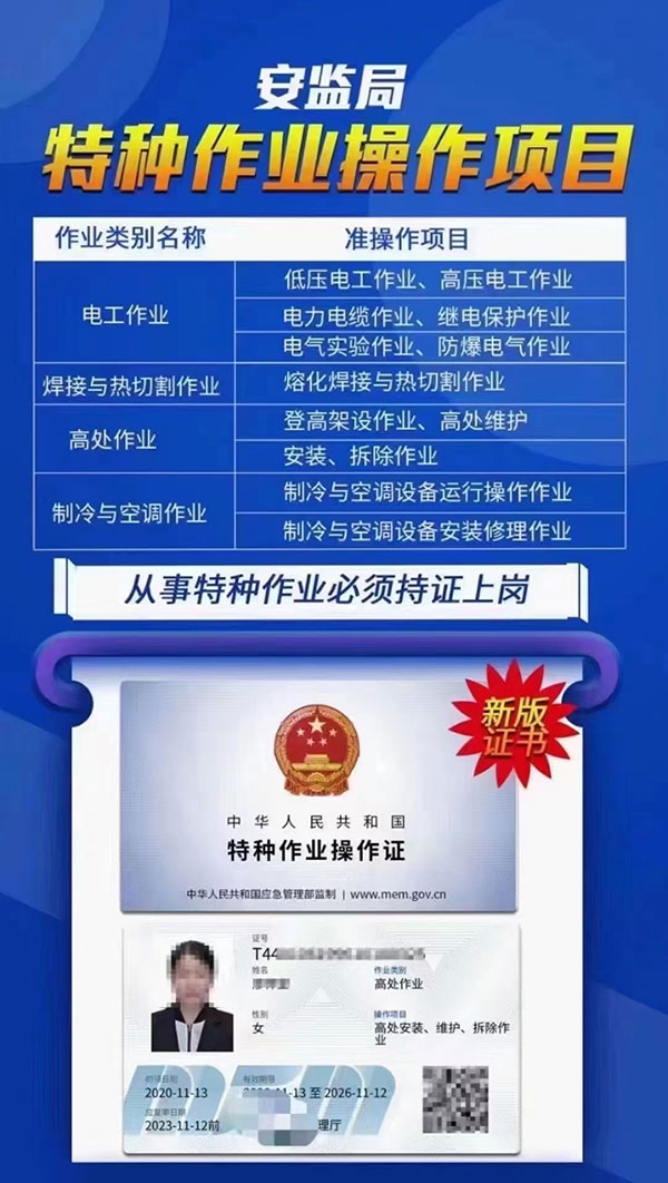 低壓電工作業,高壓電工作業,防爆電氣作業,熔化焊接與熱切割作業,壓力焊,釬焊,高處安裝維護拆除作業,登高架設作業,制冷與空凋設備運行操作作業,制冷與空凋設備安裝修理作業