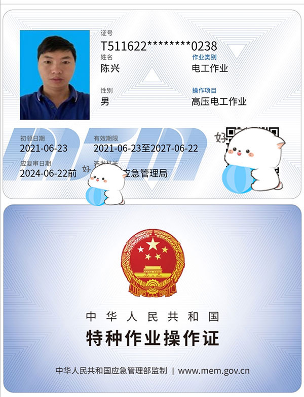 低壓電工作業,高壓電工作業,熔化焊接與熱切割作業-焊工證,電力電纜,繼電保護,電氣試驗,防爆電氣作業,高處安裝維護拆除作業,登高架設作業,制冷與空凋設備運行操作作業,制冷與空凋設備安裝修理作業,施工吊裝作業,施工挖裝作業,危化品負責人/管理人員,危化品從業人員上崗證,3年一審,終身使用。
