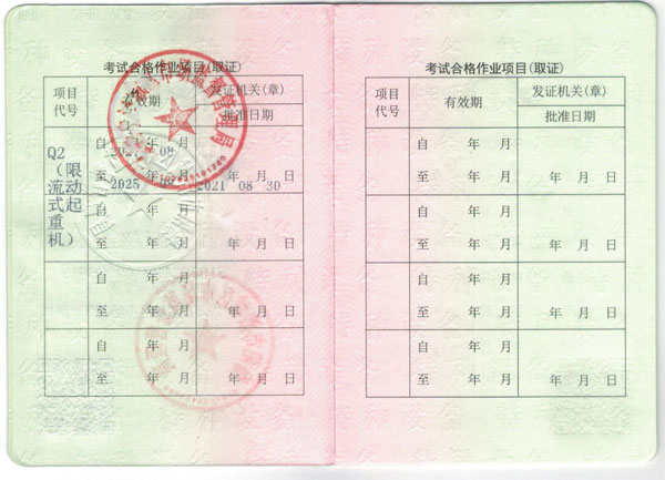 電梯維修T,特種安全設備管理A,起重機指揮Q1,Q2起重司機(限門座式起重機),Q2起重司機(限橋式起重機),Q2起重司機(限門式起重機),Q2起重司機(限纜索式起重機),Q2起重司機(限塔式起重機)Q2起重司機(限流動式起重機)Q2起重司機(限升降機),觀光和觀光列出司N2,壓力容器壓力管道管理A,電梯管理A,起重機械管理A,場(廠)內專用機動車輛管理A,工業鍋爐司爐G1,電站鍋爐司爐G2,鍋爐水處理G3,快開門式壓力容器操作R1,移動式壓力容器充裝R2,氣瓶充裝P,金屬焊接操作-壓力焊PE焊,非金屬焊接操作-壓力容器焊,食品檢驗員,化學檢驗員,農產品檢驗員(4年一審,需要到期前3個月進行)從事特殊工種作業人員必須熟悉相應特殊工種作業的安全知識及防范各種意外事故的技能。要求從業人員持卡上崗,即由國家安全生產監督管理局頒發《中華人民共和國特種作業操作證》方可上崗。