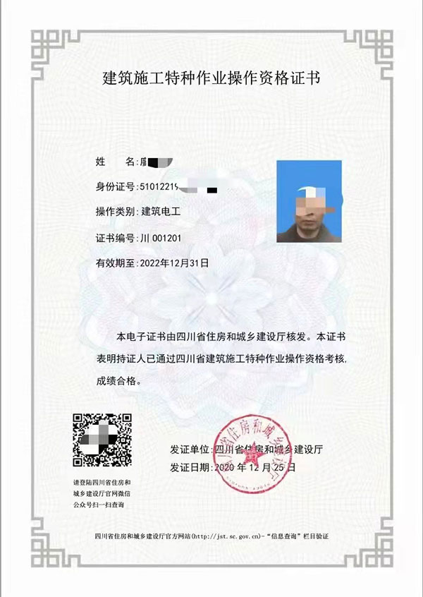 住建廳發的電工證全名叫做:建筑施工特種作業操作資格證!操作類別為建筑電工!這個證只能從事建筑類的電工作業,比如:樓房施工,水利,修路,橋梁,石油這些建筑工地使用! 其余的電工作業只認安監局頒發特種作業操作證!住建廳的證無效,比如小區物業,公司廠房,煤礦這些的維護電工!